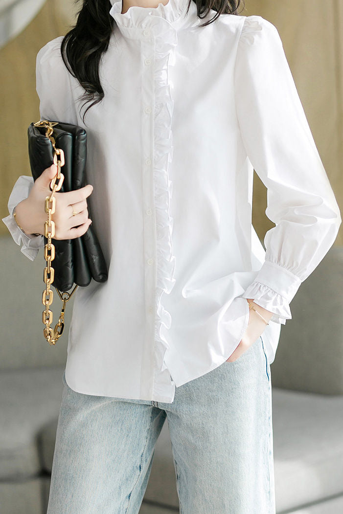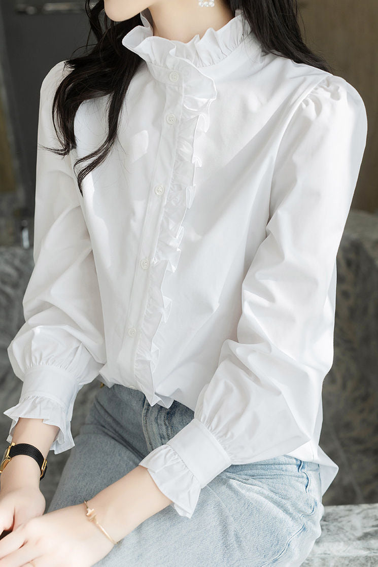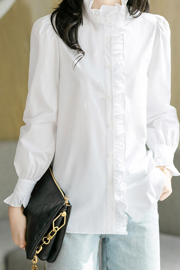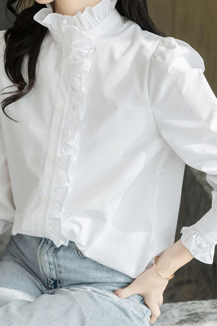 Chemise, col montant, manches longues, coupe ample, encolure, patte de boutonnage et poignets tous décorés de volants |