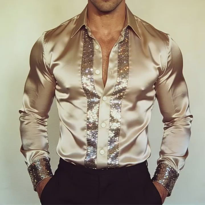 Nom du produit : Chemise Longue à Manches en Satin Rétro Casual pour Homme avec Paillettes