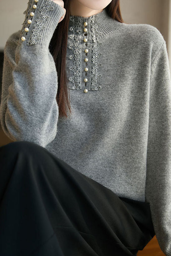 Pull tricoté, col montant mi-haut, manches longues, coupe ample, encolure et poignets décorés de perles et de dentelle, design ajouré aux joints de perles |