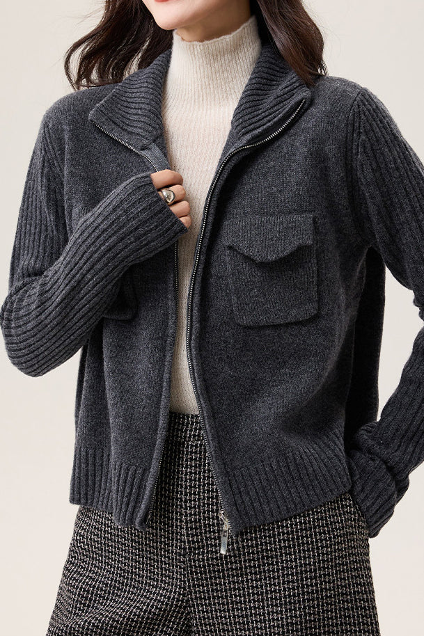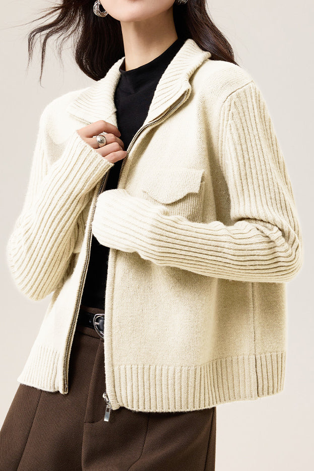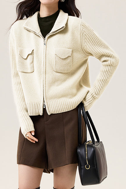 Veste tricotée, col ouvert, coupe ample à manches longues, devant central avec double zips ouvrables, design uni sur tout le corps, deux poches plaquées sur la poitrine, manches avec design à côtes larges intégrées |
